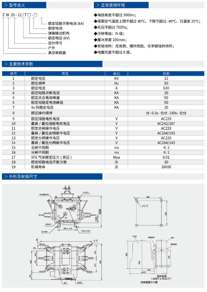 ZW20A-12户外高压真空断路器为额定电压 12kV、三相交流 50Hz的户外高压开关设备。主要用于开断、关合电力系统的负载电流、过载电流及短路电流。适用于变电站、工矿企业及城乡配电网作保护和控制,特别适用于操作频繁的场所和城网自动化配电网络。本产品与控制器配套,能满足配电自动化系统要求,并能可靠而有效地完成传统的重合器功能。它采用成熟的箱式密封结构,内部充以SF6气体,具有良好的密封性能,使之不受外界环境影响,是一种免维护产品。其弹簧操动机构采用