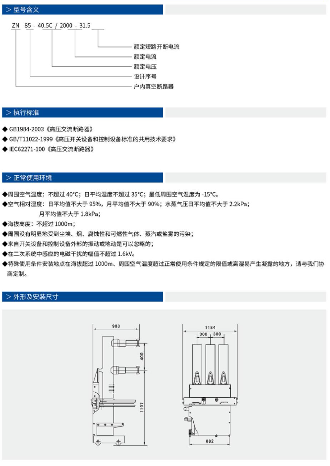ZN85-40.5户内高压真空断路器(以下简称断路器),适用于三相交流 50Hz,额定电压 40.5kV电力系统中,可供工矿企业。发电厂及变电站作为分合负荷电流、过载电流、故障电流之用。断路器与操动机构采用上下布置结构,有效地降低了断路器的深度。三相灭弧室和相联带电体由三只独立的环氧树脂绝缘筒相隔离,构成复合绝缘结构,断路器满足正常运行条件下的空气距和爬距要求,并有效地减小了断路器的体积。主导电回路真空灭弧室和动静导电联接安装在绝缘筒内,使相间距仅为 300mm。主回路电气连接全部采用固定式连接,具有很高的可靠性。绝缘安装在断路器框架上方。为这种新型断路器专门设计的弹簧操动机构,安装在断路器框架内,其结构特点更适合断路器的上下布置形式,并成为断路器整体结构中不可分割的一部分。机构设计简单,输出曲线及其性能更适用 40.5kV真空断路器的特点和要求。总体布局合理、美观、简洁。体积小巧、操作灵活、具有电气性能可靠、使用寿命长、检修方便、机构免维护的特点。该断路器适用于频繁操作及多种场合和运行条件比较苛刻的场所。