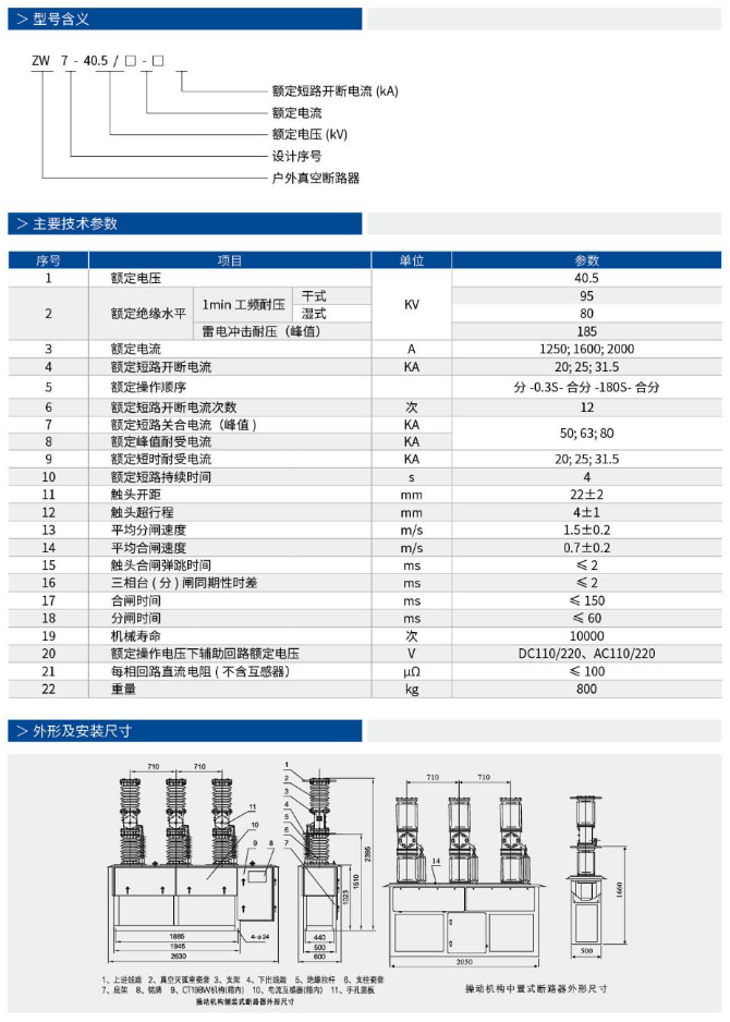 ZW7-40.5系列户外高压真空断路器(以下简称“断路器”)用于交流 50Hz、额定电压 40.5kV的三相电力系统中,作为分、合负荷电流、过载电流及短路电流之用。